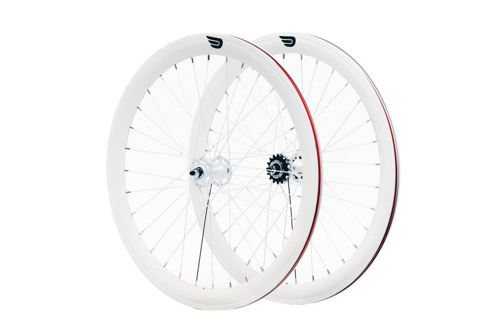 Our rear wheels feature flip-flop hubs with a pre-attached 16T fixed cog, along with a 16T freewheel cog for single-speed riding. Front and rear wheels have 32 spokes each and all wheelsets include nylon rim-strips to protect against sharp edges and prevent tube puncture.